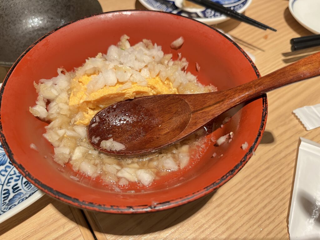 だし巻き卵の上には刻んだ大根。出汁に浸かっています。これが美味しくてたまりません。